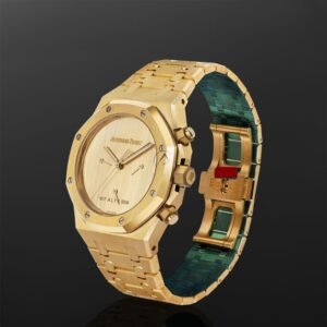Two new Royal Oak models and two new Royal Oak Offshore models cut clean and minimalist silhouettes. The former, crafted entirely in 18ct yellow gold, encompasses both the distinctive streamlined silhouette of the Royal Oak and Williams’ penchant for technical and unexpected materials. A simple dial eschews the traditional hour markers and date window, the only adornment on the gold face an understated satin-finishing, while the self-winding chronograph also leaves out the chronograph counters.