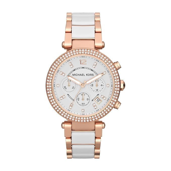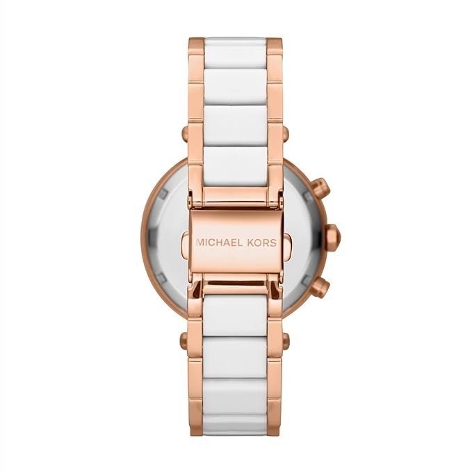 The Michael Kors Parker Watch showcases impeccable attention to detail. Featuring a chic white dial set against a dazzling rose gold-tone casing, this piece exudes a versatile charm. The delicate accents of crystal embellishments around the bezel amplify its beauty, making it a statement accessory for any occasion.