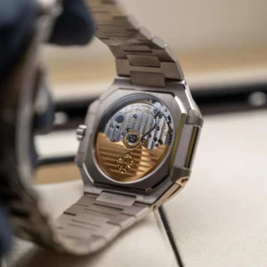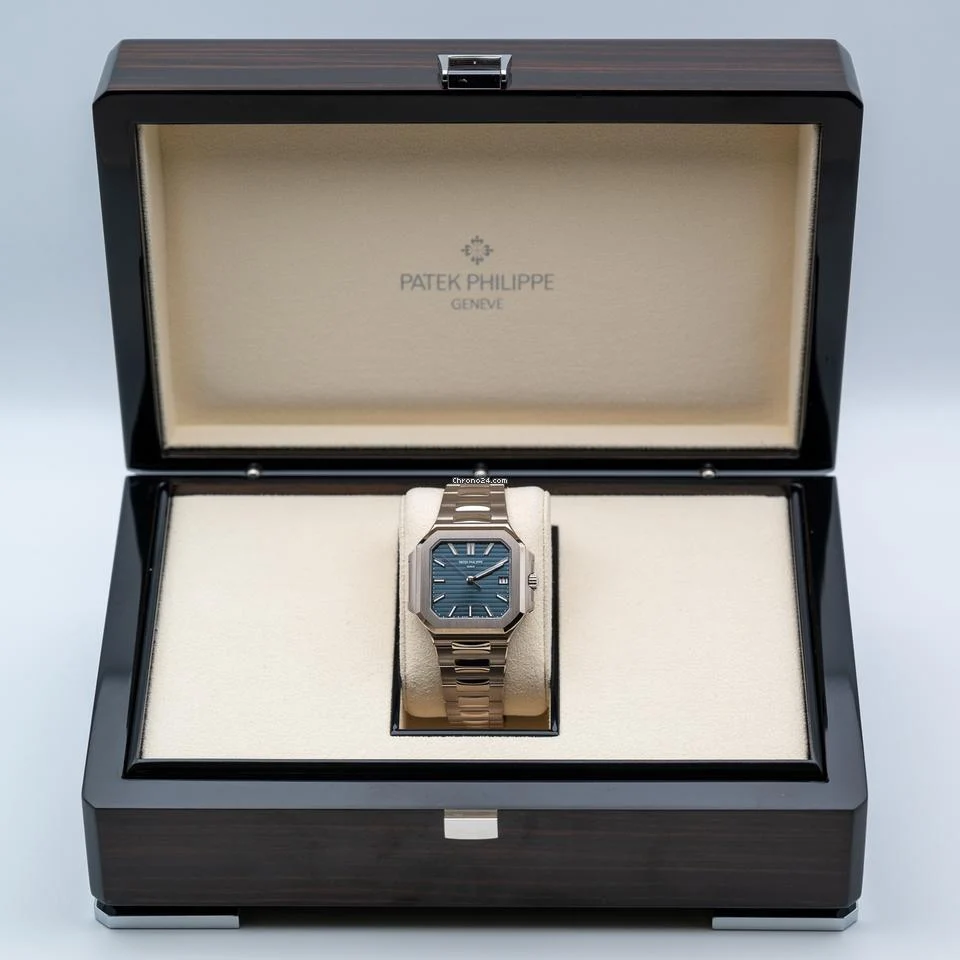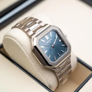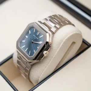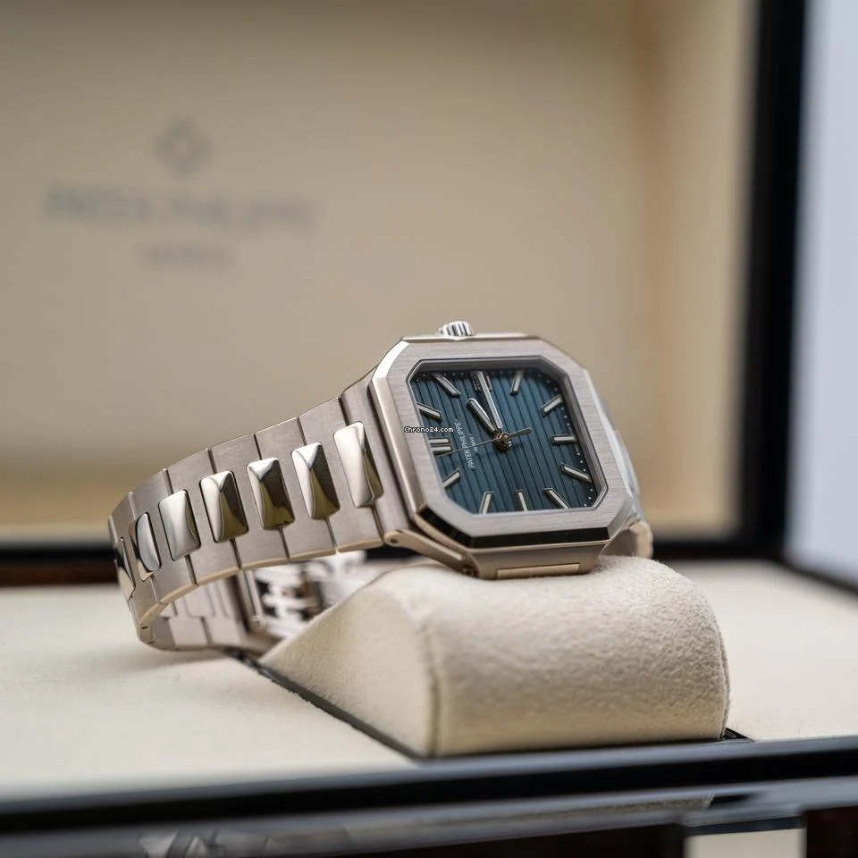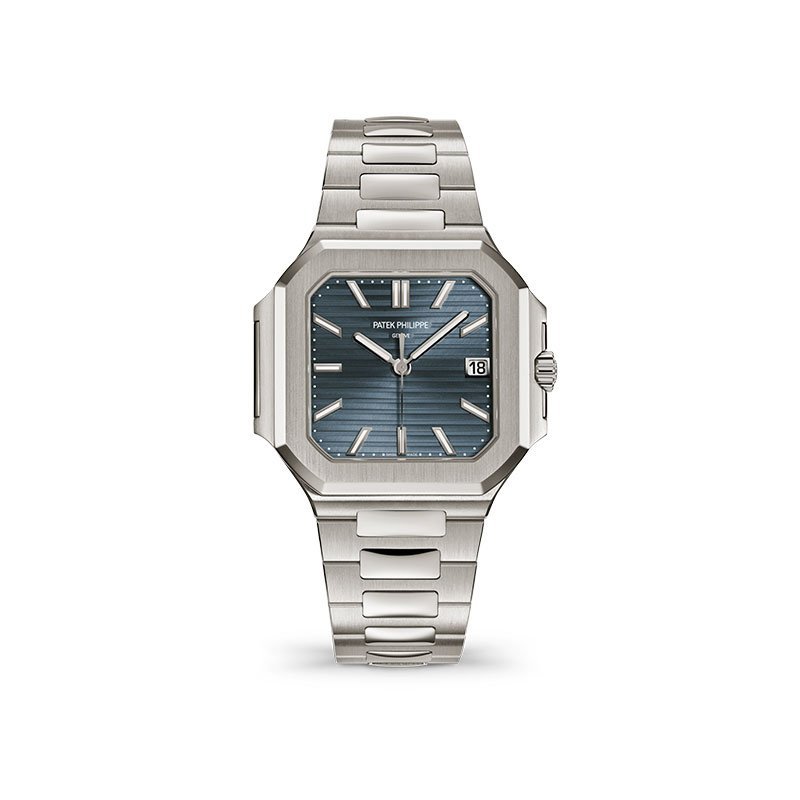 Refined and modern the 7128/1G-001 Cubitus features a medium sized white gold square case with soft curves and polished-satin contrasts. The sunburst blue gray dial is horizontally embossed accented by luminous white gold baton markers and hands. Powered by the self winding 26-330 S C/434 caliber with date and sweep seconds. Integrated gold bracelet with patented fold over clasp.