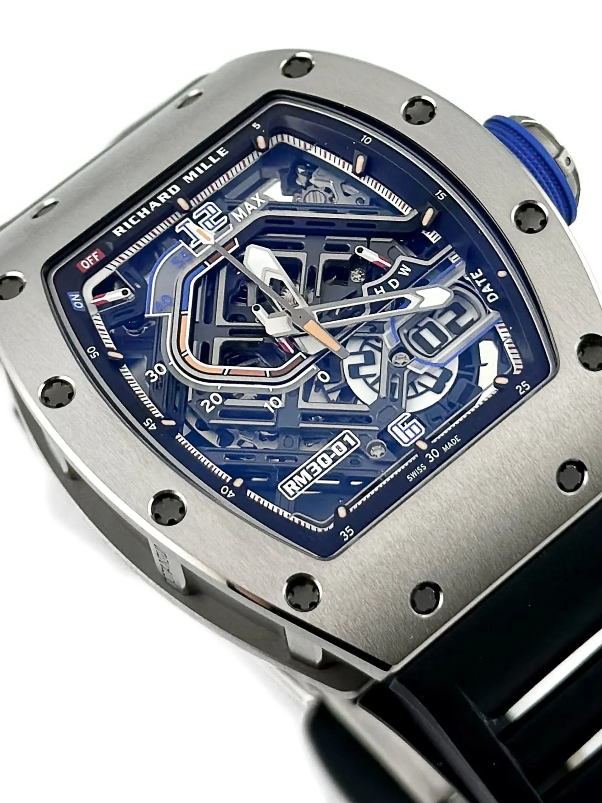 The RICHARD MILLE RM 30-01 42mm watch is a testament to the art of luxury watchmaking. Made for those who seek exceptional engineering combined with cutting-edge aesthetics, this masterpiece redefines elegance. From its lightweight yet durable case to its sleek design, every element of the RM 30-01 has been meticulously crafted to deliver a harmonious blend of performance and style.