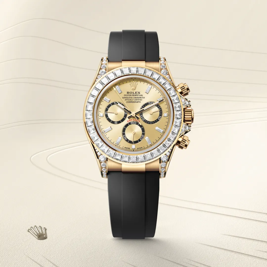 The 18 ct gold versions of the Cosmograph Daytona with a Cerachrom bezel are available with an Oysterflex bracelet. Developed by Rolex and patented, it singularly combines the robustness of a metal bracelet with the comfort of an elastomer bracelet. It is made up of two flexible curved metal blades – one in each bracelet section – overmoulded with high-performance black elastomer. For optimum comfort, the Oysterflex bracelet is equipped with cushions on its inner sides and an Oysterlock safety clasp to prevent accidental opening. Its length may be adjusted via the ingenious Rolex Glidelock extension system.