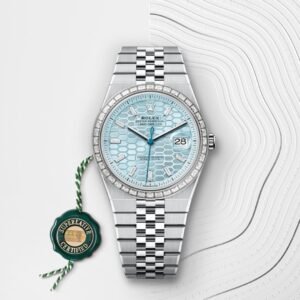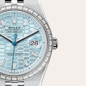 This ice blue – a colour reserved for watches made of platinum – dial is adorned with a honeycomb motif with a sunray finish. Its creation calls on traditional craftsmanship and high-technology methods, all mastered in-house. The honeycomb structure is cut with a femtosecond laser, which is also used to etch the delicate lines in the grooves separating each cell. The dial is set with 10 baguette-cut diamonds to mark the hours.